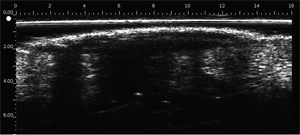 Posterior attenuation in the dermis due to prominent entry echo (heavily keratinized tumour).